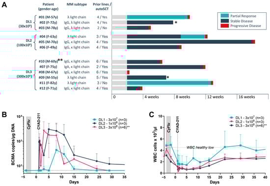 Clinical evaluation of CYAD-211. (A) Response and duration of response until progression in IMMUNICY-1. (B) CYAD-211 cell kinetics were determined by digital droplet polymerase chain reaction on genomic DNA from peripheral blood mononuclear cells isolated from blood collected at pre-specified timepoints. Values below the lower limit of quantification (LLOQ) were set at LLOQ (dotted line, 65.2 copies/µg DNA). Data were pooled per dose level (DL). * Patient discontinuation prior to disease progression; ** one patient was enrolled in Cohort 3 but due to a human error while preparing the CYAD-211 infusion, the patient received a third of a dose-level 3, corresponding to a dose-level 2. (C) Absolute white blood cells (WBC) kinetics in the peripheral blood. Value considered as a healthy minimal level is indicated in the dotted line (dotted line, 4.5 × 103 cells/µL). Data were pooled per dose level, as in (B). CyFlu: cyclophosphamide and fludarabine preconditioning.