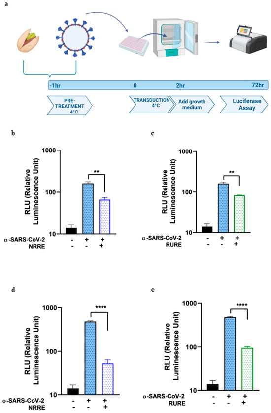 The inhibitory binding activity of both NRRE and RURE on the two SARS-CoV-2 pseudotypes was assessed by measuring the luciferase activity, and the results were reported as relative luciferase units (RLU) and compared to untreated cells. The procedure is graphically reported in Figure 1 Panel a. The results showed that both extracts reduced the entry of α (Figure 1, panels b and c) and ο-SARS-CoV-2 pseudoviruses (Figure 1, panels d and e).