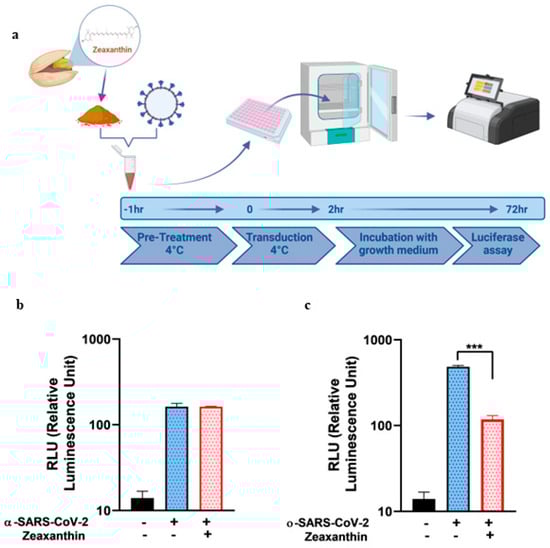 In vitro pseudovirus binding assay using zeaxanthin against α-SARS-CoV-2 and ο-SARS-CoV-2 pseudotypes. (a) Schematic diagram of the binding assay. (b,c) The luciferase activity was performed in A549 cells 72 h post-infection with or without zeaxanthin (10 µM) using α and ο-SARS-CoV-2 S-pseudotyped particles. Experiments were performed in triplicates, and the data presented the RLU of three independent experiments (n = 3). Error bars indicate standard deviation (SD). The asterisks (***) indicate the significance of p-values less than 0.001 compared to untreated infected α and ο-SARS-CoV-2 pseudotyped particles.