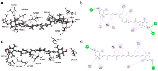 The crystallographic structures of the RBDs in complex with ACE2 were used to investigate the interactions between the spike proteins of the alpha and omicron variants and zeaxanthin. A detailed analysis of the two-dimensional interaction diagram (Figure 3) revealed that zeaxanthin engages in hydrophobic interactions with the RBD alpha variant (Figure S4). Specifically, the isoprene units of zeaxanthin interact with Ala386, Ala387, and Pro389, while the aliphatic ring interacts with His34, Pro321, and Met383 (Figure 3a,b). Additionally, two hydrogen bonds were identified between the hydroxyl groups at the terminus of zeaxanthin’s aliphatic chain and the residues Lys26 and Met323.