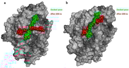 View of the hydrophobic surface (grey) of the α-RBD (a) and ο-RBD (b) domain and docked zeaxanthin before (green) and after 200 ns of MD simulation (red).