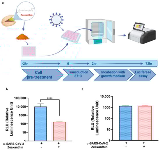 In vitro pseudovirus entry inhibition assay following zeaxanthin treatment. (a) Schematic diagram of pseudovirus entry inhibition assay. (b,c) The luciferase activity was performed in A549 cells 72 h post-infection with or without zeaxanthin (10 µM) using α-SARS-CoV-2 and ο-SARS-CoV-2 pseudoviruses. Experiments were performed in triplicates, and data represented the RLU of three independent experiments (n = 3). Error bars indicate standard deviation (SD), and **** indicates the significance of p-values less than 0.0001.