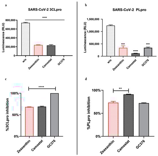 Proteases have been identified in DNA or RNA viruses and enveloped and non-enveloped viruses. These enzymes can use different catalytic mechanisms involving Ser, Cys, or Asp residues to attack the cleavable peptide bond with a high degree of recognition of specific cleavage []. Given the role of zeaxanthin in the modulation of cellular protease TMPRSS2, we performed an in vitro screening for 3CLpro and PLpro. 3CLpro (also known as Main Protease or Mpro) and PLpro are chymotrypsin-like proteases encoded in the SARS-CoV-2 genome and play essential roles in the virus’s lifecycle. A luminescent protease assay was carried out to verify the anti-protease activity of zeaxanthin (Figure 5). Recombinant SARS-CoV-2 3CLpro and PLpro were separately combined with luminogenic 3CLpro substrate and zeaxanthin for 60 min at 37 °C. The reaction was stopped by adding Luciferin Detection Reagent, and the luminescence was recorded on a plate-reading luminometer. The GC376 was used as a positive control. The results expressed as RLU and percentage of inhibition of enzymatic activity (Figure 5, panels a and c) showed that the enzymatic activity of 3CLpro was inhibited following incubation with zeaxanthin. Similarly, zeaxanthin significantly reduced the activity of papain-like protease PLpro, as Figure 7b,d reports.