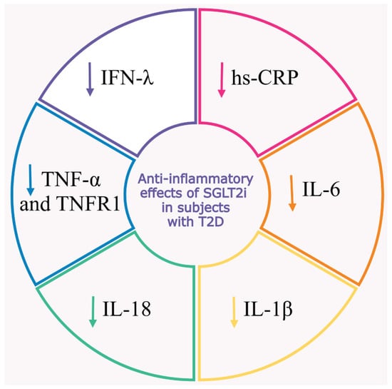 | Iannantuoni et al. (2019) | Empagliflozin | T2D | Decrease in hs-CRP and increase in IL-10 concentrations after 24 weeks of treatment. | [74] |