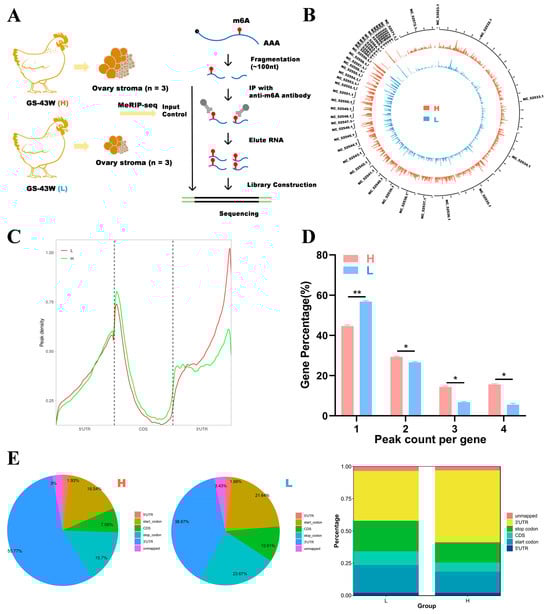 Research on m6A modification profiles in the ovaries of Gushi chickens. (A) Ovary tissue was collected from 43-week-old Gushi chickens in group H (n = 3) and group L (n = 3) for MeRIP-seq. (B) The distribution of m6A peak sites in the Gallus gallus (chicken) genome was obtained from two different samples. The outermost circles represent the distribution of chromosomes in the genome, with red circles representing group H and blue circles representing group L. (C) Density distribution of the m6A peaks in H and L transcripts in the different gene structures. (D) Statistical graph of the peak numbers of genes in the L and H groups. The difference between the peak numbers of genes in the L and H groups was detected using Student’s t test (* p < 0.05; ** p < 0.01;). (E) Distribution of m6A peaks in the L and H groups.