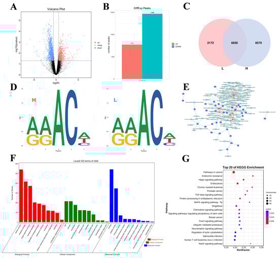 Overview of the differential methylation peaks in the L vs. H comparison groups. (A) Volcano plot of the DMG expression results (the dotted line signifies the threshold for statistical significance). (B) Number of up- and downregulated DMPs. (C) The number of common and specific m6A peaks in the L and H groups. (D) The motif sequence “RRACH” was identified in the L and H. (E) Pathways and co-differential genes network diagram. (F,G) GO enrichment terms and KEGG analysis of DMGs.