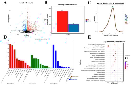 These samples were also analyzed using RNA-seq, and the generated volcano dia-gram shows the general distribution of the differentially expressed genes (DEGs; Figure 4A). In this study, a total of 19,902 genes were identified in the two groups, and 1436 genes were differentially expressed in the H group compared with the L group (1041 upregulated genes and 395 downregulated genes; p < 0.05 and |fold change (FC)| > 1.5; Figure 4B). The gene expression abundance and density data are shown in Figure 4C. To further reveal the functions of the DEGs, we conducted GO and KEGG enrichment analyses. The results from the GO enrichment analysis of the DEGs are shown in Figure 4D. Among the biological processes, the DEGs were enriched mainly in cellular processes, single organism processes, metabolic processes, biological regulation, and regulation of biological processes. In the cellular component category, the DEGs were significantly correlated mainly with membrane, cell, cell part, and membrane part. In the molecular function category, the DEGs were involved mainly in binding activity, catalytic activity, and transporter activity. The KEGG enrichment analysis revealed that the DEGs were significantly enriched in protein digestion and absorption, the PPAR signaling pathway, thyroid hormone synthesis, and steroid hormone biosynthesis (Figure 4E).