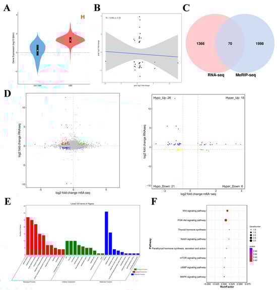Joint analyses of m6A-seq and RNA-seq data. (A) Violin plot of expression with/without m6A-modified genes. (B) Scatter plot of gene expression levels and peak enrichment multiples (the gray area represents the confidence interval. Specifically, it represents the uncertainty range of regression line estimation). (C) Wayne map of shared differentially expressed genes. (D) L vs. H quadrant diagram (the dotted line signifies the threshold for statistical significance; the four colors signify four distinct scenarios: mRNA exhibiting concurrent upregulation or downregulation with the m6A group, or alternatively, one group demonstrating upregulation while the other shows downregulation). (E,F) GO enrichment terms and KEGG analysis of co-differentially expressed genes (intersecting genes of DMGs and DEGs).