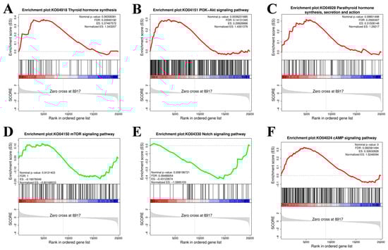Gene set enrichment analysis (GSEA). (A) Thyroid hormone synthesis. (B) PI3K-Akt signaling pathway. (C) Parathyroid hormone synthesis. (D) mTOR signaling pathway. (E) Notch signaling pathway. (F) cAMP signaling pathway. The gray area in the figure represents a point in the gene list where the Enrichment Score (ES) crosses a zero value. The dashed line usually represents the Zero cross point of the enrichment score.