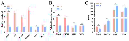 Experimental results. (A) Methylase gene levels were detected using MeRIP-qPCR. (B) The relative mRNA expression level was detected using qRT–PCR. (C) Gene change levels based on RNA-Seq data. The significance of the difference between the gene expression levels of the H group and L group was determined by Student’s t test (* p < 0.05; ** p < 0.01; *** p < 0.001, ns p > 0.05).