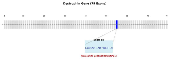 Given the patient’s clinical presentation, characterized by motor delay and significantly elevated CK levels suggestive of muscular dystrophy, we performed single gene-filtered NGS of the DMD gene. This revealed a pathogenic variant in exon 55 (NM_004006.3, DMD: g.1716784_1716785del; c.8064_8065delTA; p.(His2688GlnfsTer21)), classified as pathogenic according to the American College of Medical Genetics and Genomics (ACMG) criteria (PVS1—Pathogenic Very Strong 1, PM2—Pathogenic Moderate 2, PS4—Pathogenic Strong 4), thus confirming the diagnosis of Duchenne muscular dystrophy at the age of three [15]. This genetic finding is illustrated in Figure 1. Our literature review identified a single article reporting the same genetic variant found in our patient. However, that study did not include any phenotypic data, limiting the ability to establish genotype–phenotype correlations [13].