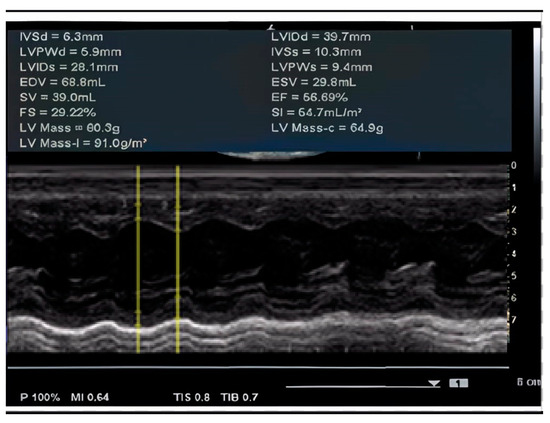 Standard echocardiography was performed during routine cardiac evaluations, detecting longitudinal ventricular dysfunction and progressive ventricular dilation. These findings were consistent with evolving dilated cardiomyopathy, as evidenced by the increasingly globular appearance of the heart [37].