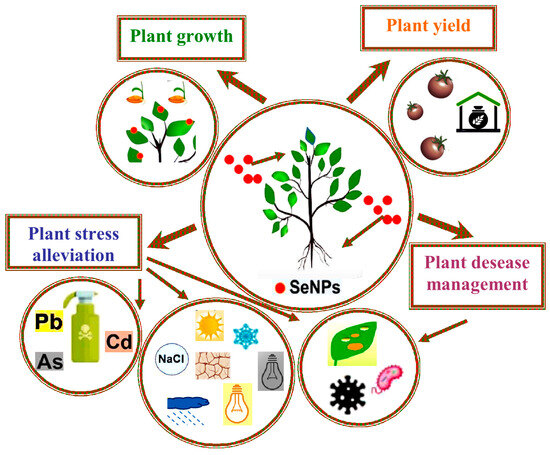 Crop productivity contributes enormously to global food security and support of human wellbeing. Chemical fertilizers, pesticides, and other agrochemicals have a negative impact on ecosystems by reducing biodiversity, soil fertility, and by developing resistance against pathogens [1]. Among innovative agricultural technologies, nanotechnology has attracted more interest in the agricultural sector [2]. The term “nanotechnology” was coined by Norio Taniguchi [3]. Nanotechnology deals with manufacturing, research and manipulation of matter at nanoscale [4,5]. New prospects for integrating nanotechnologies in different fields have revolutionized the agroindustry. Agroapplicable nanomaterials could be used without altering the beneficial properties of the soil and could likewise protect plants from adverse environmental impacts; accordingly, nanoproducts preserve the health of the plant [6]. At present, selenium (Se) is referred to as a beneficial element in plants [7]. There is a necessity to develop deeper insight into the status of Se nanoparticles (SeNPs) in plant research (Figure 1), to make comparisons with bulk Se, and to identify the key knowledge gaps. Steps should be taken to accumulate and generalize previous research, and to update information on SeNPs’ interaction with plants under abiotic stress conditions. There is also a requirement for detailed data concerning ecological safety of the Se-containing formulations, including their implementation in cultivated plants, to elucidate consequences of chemically and biologically fabricated Se-containing product usage. The present review is aimed at gaining a better understanding of how nanoselenium benefits plants, at providing information on the proposed stress-alleviating mechanisms in plants exposed to the diversely originating Se agents. Generally, the use of commercially available nanoscale agrochemicals, nanoforms of plant fertilizers, fungicides, and problems of the plant disease management will not be considered.