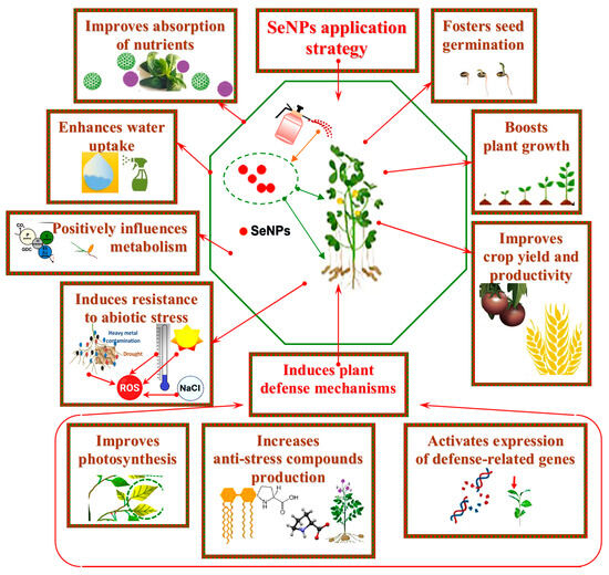 Thus, SeNP application improves growth traits under various stresses [38]. Current research denotes a positive influence on crops with respect to seed germinability, growth, and other agriculturally relevant indicators shown to be associated with Se-containing nanomaterial treatment. The above effects are mediated by the SeNPs’ interaction with plant cells [41], thereby promotion of water and nutrients uptake and improved development in plants.