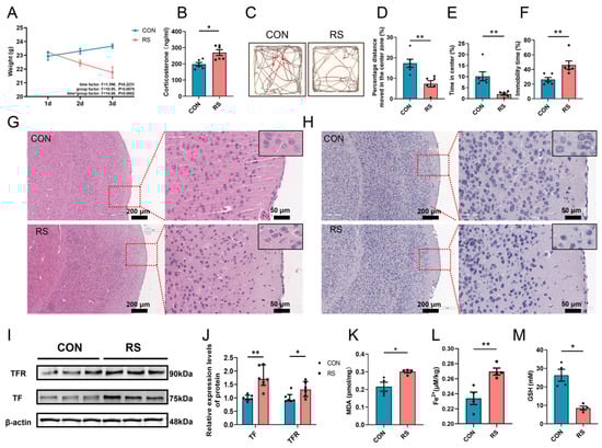 Acute stress induced depressive-like behavior and PFC neuronal damage in mice. (A) Body weight of the mice in the CON and RS groups over the initial three-day period. Data are expressed as mean ± SEM, with statistical significance assessed via two-factor repeated measures ANOVA. (B) Serum corticosterone levels in the two groups of mice. (C) Representative movement trajectories of the two groups of mice during the open field test. Red lines show the mice’s movement in the central zone, and brown lines indicate its trajectory in the peripheral zone. (D,E) In the open field test, the percentage of movement distance within the central area (D) and the percentage of residence time in the central area (E). (F) The percentage of immobile time in the tail suspension test. n = 6. (G,H) Representative images of HE staining (G) and Nissl staining (H) of the PFC in the two groups of mice. Scale bars: 200 μm and 50 μm. (I,J) The relative protein expression levels of TF and TFR in the PFC. n = 6. (K–M) The MDA content (K), Fe2+ content (L), and GSH content (M) in the PFC of the two groups of mice. n = 4. Data were presented as mean ± SEM. Statistical significance between the two groups was assessed using Student’s t-test for normally distributed data, and the Mann–Whitney rank sum test for data that did not follow a normal distribution. Significance levels were denoted as * p < 0.05 and ** p < 0.01.