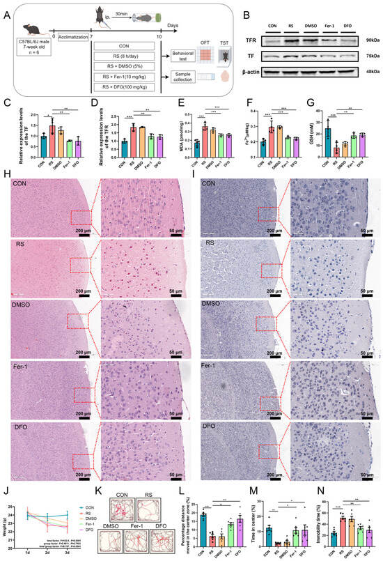 Considering all the aforementioned indicators are associated with ferroptosis, we hypothesized that ferroptosis in PFC neurons contributes to acute stress-induced PFC injury and depression-like behavior in mice. To test this hypothesis, we administered ferroptosis inhibitors Fer-1 and DFO in an acute restraint stress mouse model. The experimental procedure is illustrated in Figure 2A. Our findings indicate that supplementation with Fer-1 and DFO significantly mitigated ferroptosis in the PFC of RS mice. Compared to the RS group, the expression levels of TF and TFR, as well as the contents of MDA and Fe2+, in the PFC of the Fer-1 and DFO groups were significantly reduced, while the content of GSH was significantly elevated (Figure 2B–G). Conversely, no significant changes were observed in these parameters within the DMSO group. These findings suggest that ferroptosis occurs in the PFC neurons of acutely stressed mice. Furthermore, we observed that the neuronal damage in the PFC was significantly ameliorated in the Fer-1 and DFO groups compared to the RS group (Figure 2H,I). Moreover, although there was no significant difference in body weight change between the Fer-1 and DFO groups (Figure 2J), the depression-like behavior of the mice was significantly alleviated (Figure 2K–N). These findings suggest acute stress-induced ferroptosis of PFC neurons is implicated in the manifestation of depression-like behaviors in mice.