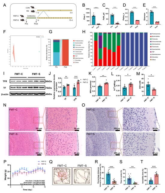 The gut microbiota is implicated in ferroptosis within the PFC of acutely stressed mice. (A) Experimental flowchart of FMT. The figure was drawn by Figdraw, ID:RWTIU78278. (B–E) Alpha diversity indices (Chao1, Faith’s_pd, Pielou_e, Shannon) of gut microbiota in mice before and after antibiotic treatment. (F) The beta diversity analysis of gut microbiota in mice before and after antibiotic treatment, utilizing PCoA analysis based on the Bray–Curtis distance. The Adonis test was employed to identify statistical differences between the two groups. (G,H) The relative abundance of gut microbiota at the phylum level before and after antibiotic treatment. n = 6. (I,J) The relative protein expression levels of TF and TFR in the PFC of mice from the FMT-C and FMT-S groups. (K–M) The MDA content ((K), n = 6), Fe2+ content ((L), n = 6), and GSH content ((M), n = 5) in the PFC of the two groups of mice. (N,O) Representative histological images of HE staining (N) and Nissl staining (O) in the PFC of mice from the FMT-C and FMT-S groups. Scale bars: 200 μm and 50 μm. (P) Monitoring of body weight changes in mice from the FMT-C and FMT-S groups over a 15-day period following fecal microbiota transplantation. Data are presented as mean ± SEM, and statistical significance was assessed using two-factor repeated measures ANOVA. (Q) Representative movement trajectories for each group of mice in the open field test. Red lines show the mice’s movement in the central zone, and brown lines indicate its trajectory in the peripheral zone. (R,S) In the open field test, the percentage of movement distance (R) and the percentage of residence time (S) in the central area. (T) The percentage of immobile time for each group of mice during the tail suspension test. n = 7. Data are expressed as mean ± SEM. The Student’s t-test was employed to assess the statistical significance between the two groups when the data followed a normal distribution. Conversely, the Mann–Whitney test was utilized to evaluate the statistical differences between the groups when the data deviated from a normal distribution. * p < 0.05, ** p < 0.01, *** p < 0.001. Pre: before antibiotic treatment. Post: after antibiotic treatment.