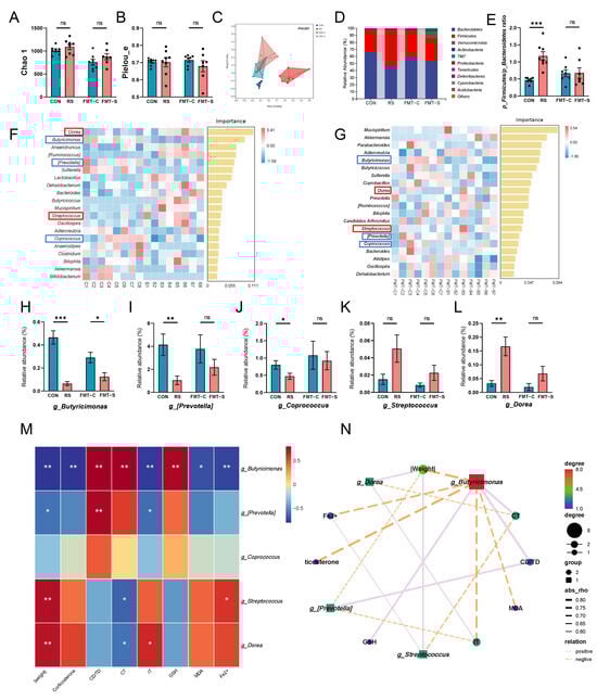 To investigate key gut bacteria involved in ferroptosis of PFC neurons in mice subjected to acute stress, we used 16S rDNA (V3–V4 region) sequencing technology to assess gut microbiota composition in mice undergoing the acute restraint stress and fecal microbiota transplantation. The findings indicated no significant difference in alpha diversity, as measured by the Chao1 and Pielou_e indices, between CON and RS mice (Figure 4A,B). However, significant β diversity differences were observed (Figure 4C). At the phylum level, both CON and RS intestinal microbiota were predominantly composed of p_Bacteroidetes, and p_Firmicutes. Relative to CON, RS had reduced p_Bacteroidetes and increased p_Firmicutes, resulting in a significantly elevated p_Firmicutes/p_Bacteroidetes ratio (Figure 4D,E). Furthermore, the gut microbiota composition of FMT-C and FMT-S mice showed significant differences, with dominant phyla reverting to p_Bacteroidetes and p_Firmicutes. However, no significant differences were observed in alpha diversity or p_Firmicutes/p_Bacteroidetes ratio between the two groups.
