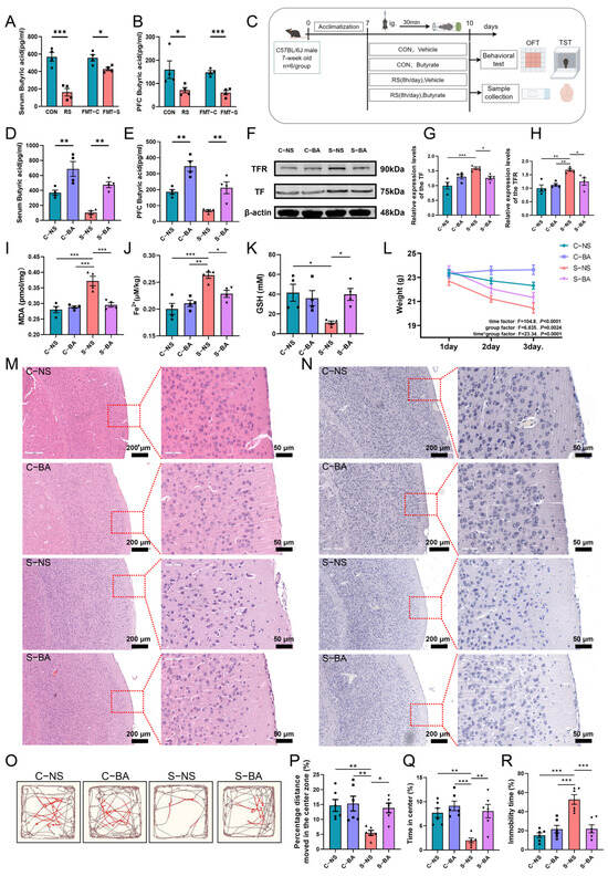 Histological examination using HE staining and Nissl staining revealed that, relative to the C-NS group, the C-BA group of mice did not display significant damage to the PFC. In contrast, the S-NS group of mice exhibited pathological alterations, including edema of certain neurons, an increased number of red neurons with red cytoplasm, loss of Nissl bodies, and cellular pyknosis and hyperchromasia (Figure 5M,N). Furthermore, in comparison to the C-NS group, the S-NS group exhibited a significant reduction in body weight (Figure 5L), the percentage of moving distance, and the percentage of time spent in the central area of the open field test (Figure 5O–Q). Additionally, the percentage of stationary time was markedly increased in the tail suspension test (Figure 5R). Notably, following butyrate supplementation, there was a significant amelioration in both the damage to PFC neurons and the depression-like behaviors in the S-BA group (Figure 5M–R). These findings indicate that butyrate has the potential to regulate ferroptosis in PFC neurons in mice subjected to acute stress. This regulation may consequently mitigate PFC neuronal damage and reduce depression-like behaviors in these mice.