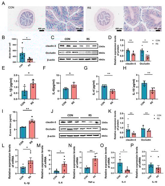 To further investigate the mechanisms by which key intestinal flora and their metabolites influence ferroptosis in PFC neurons during acute stress, we initially assessed intestinal barrier indices in mice from both the CON and RS groups. Alcian Blue Stain results demonstrated a significant reduction in the number of Alcian blue-positive cells in the colon tissue of the RS group compared to the CON group (Figure 6A,B). Furthermore, the expression levels of tight junction proteins Occludin and Claudin-5 were markedly decreased in the colon tissue of RS mice (Figure 6C,D), suggesting substantial impairment of the intestinal barrier in these mice. Disruption of the intestinal barrier can facilitate translocation of harmful substances from the intestine into the bloodstream, thereby triggering an inflammatory response []. Consequently, we measured serum levels of inflammatory markers. Results indicated that, in comparison to the CON group, the RS group exhibited a significant increase in serum levels of pro-inflammatory cytokines IL-1β and IL-6, alongside a significant decrease in serum levels of anti-inflammatory cytokines IL-4 and IL-10 (Figure 6E–H). Simultaneously, our findings revealed a significant increase in the content of Evans blue in the PFC of the RS group compared to the CON group. Additionally, there was a marked decrease in the expression of tight junction proteins Occludin and Claudin-5 in the PFC (Figure 6I–K). These results indicate a significant increase in blood–brain barrier permeability in the RS group mice. Compromised integrity of the blood–brain barrier can facilitate entry of inflammatory factors and other deleterious substances into the brain, thereby inducing neuroinflammation []. Subsequently, we investigated the inflammatory status of the PFC in CON and RS mice. Results indicated that the mRNA levels of pro-inflammatory cytokines IL-1β, IL-6, and TNF-α were significantly elevated in the PFC of the RS group compared to the CON group. Conversely, the mRNA levels of the anti-inflammatory cytokines IL-4 and IL-10 were significantly reduced in the RS group relative to the CON group (Figure 6L–P). These findings indicate that acute stress compromises the integrity of the gut barrier and blood–brain barrier, while simultaneously amplifying the systemic inflammatory response and the inflammatory state within the PFC. This may represent a pivotal mechanism through which key gut microbiota and their metabolites influence ferroptosis in PFC neurons in mice.