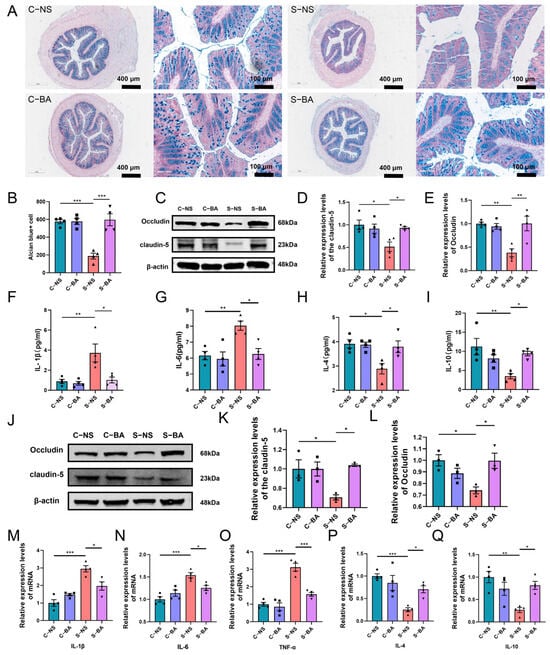 To elucidate the mechanism by which butyrate mitigates ferroptosis in PFC neurons of acutely stressed mice, we investigated alterations in the gut barrier and blood–brain barrier, as well as inflammation levels in the serum and the PFC of RS mice following butyrate supplementation. The results indicated that, in comparison to the C-NS group, the S-NS group exhibited a significant reduction in the number of Alcian Blue-positive cells within colon tissue (Figure 7A,B). Additionally, there was a marked decrease in the expression levels of tight junction proteins Occludin and Claudin-5 (Figure 7C–E). Furthermore, serum analysis revealed a significant increase pro-inflammatory cytokines IL-1β and IL-6, alongside a significant decrease anti-inflammatory cytokines IL-4 and IL-10 (Figure 7F–I). Moreover, the expression levels of tight junction proteins Occludin and Claudin-5 in the PFC of the S-NS group were significantly reduced (Figure 7J–L). Concurrently, the mRNA levels of pro-inflammatory cytokines IL-1β, IL-6, and TNF-α in the PFC were markedly elevated, whereas the mRNA levels of anti-inflammatory cytokines IL-4 and IL-10 were significantly diminished (Figure 7M–Q). In comparison to the C-NS group, the C-BA group did not exhibit significant differences in the aforementioned indicators. However, in comparison to the S-NS group, the S-BA group supplemented with butyric acid exhibited significantly enhanced improvements in the aforementioned indicators. These findings suggest that butyrate supplementation can mitigate damage to the gut barrier and blood–brain barrier, attenuate the inflammatory response, and ameliorate ferroptosis in prefrontal cortex neurons in mice subjected to acute stress.