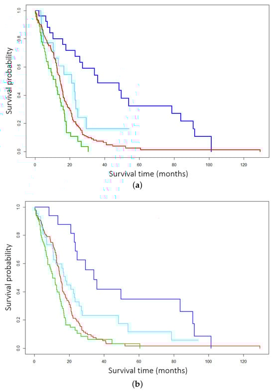 First, utilizing both EM and EM*, DCEM was employed to cluster multiomics data from The Cancer Genome Atlas glioblastoma (GBM) data repository. Both EM and EM* underwent identical preprocessing. First, feature selection was performed via Cox by selecting the most relevant features. Next, both methods were trained with multiomics data by stacking DNA, mRNA, and miRNA . In Figure 1a,b the EM* routine achieves a p-value of 0.000000211 from the log-rank test, and the traditional EM scores a p-value of 0.0000344 from the log-rank test—in this instance of DCEM clustering, with three types of data and 276 patients. Here, Kaplan–Meier curves are an important piece of evidence by which the efficacy of the EM* algorithm is determined. For both BRCA and GBM, four clusters were used for the primary study. Four clusters enable comparison to cutting-edge techniques and popular benchmarking subtypes. Additionally, particularly distinct subgroups—usually distinguished by low survivability—can be verified. The four clsuters on the graph are arbitrarily assigned colors to denote to survival probabilty across groups.