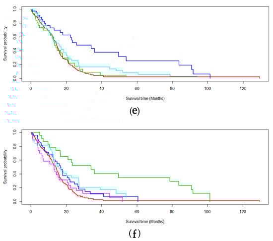 Additionally, Figure 3 studies the robustness of EM* for multiomics survival analysis as values of k are toggled. Here, k denotes the number of latent variables chosen to model the subtypes in the expectation–maximization scheme. Values of are studied for TCGA-BRCA and TCGA-GBM. The respective average p-values recorded for each survival analysis are 0.00042 (Figure 3a), 0.0000416 (Figure 3b), 0.0152 (Figure 3c), 0.0000004 (Figure 3d), 0.000523 (Figure 3e), and 0.000121 (Figure 3f).