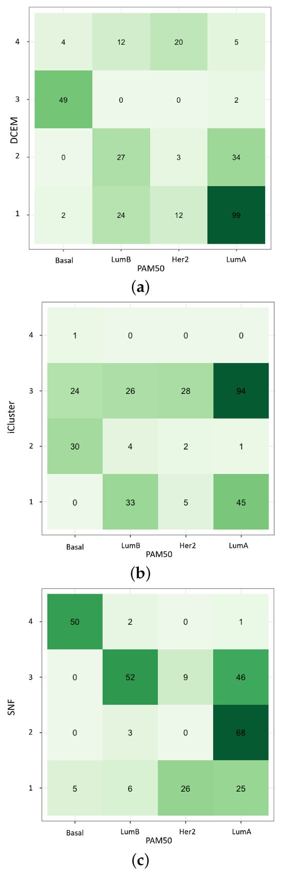 Finally, while using DCEM with EM* on the TCGA-BRCA multiomics dataset, the concordance of various methods is compared to the PAM50 benchmarking subtypes: LumA, LumB, Her2, and Basal. The Pam50 subtypes are available for download using the package [31]. Other multiomics frameworks utilized include the package built-in [6] and [32] functions on DNA and mRNA . Most notably, in Figure 4, concordance with PAM50 varies among methods—each correlating closely in different ways—but each achieves strong survival probabilities. Most notably, DCEM performs equally well at subtyping the particularly separable BRCA subgroup: Basal. Additionally, DCEM improves upon the difficult task of distinguishing the LumA from the LumB subtypes.
