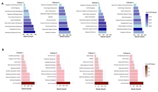 The pathway enrichment for each subtype from BRCA tumor patient data can be seen in Figure 5. The four groups informing the subtype analyses are the DCEM with EM* routine found in Figure 3b. Across subtypes, there is an overrepresentation of developmental pathways. This similarity is an expected result, as the differentially expressed gene profiles across subtypes were similar as well. However, there are some notable differences in the overexpressed pathways between subtypes. While there are developmental pathways consistent across the four subtypes, there are some subtle differences. Subtypes 1 and 3 showed overrepresentation for the Regulation of Membrane Potential and Cell–Cell Signaling pathways. Subtype 2 demonstrated overrepresentation for the Response to Endogenous Stimulus pathway. The overlapping pathways between some subtypes, as well as some unique pathways, show that some subtypes are more functionally related than others, based on their specific differentially expressed genes.