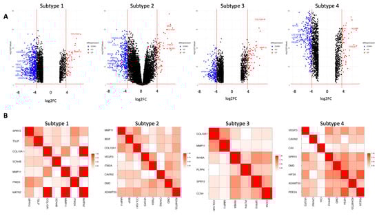 In Subtype 1, the gene RGMA is downregulated, with a log2fold change of approximately −8. RGMA is known to be a tumor suppressor gene, not specific to breast cancer. A study by Li et al. demonstrated that the inhibition of RGMA leads to increased breast cancer tumor cell proliferation [48]. In fact, overexpression of RGMA has been shown to decrease breast cancer in humans [48]. Another gene downregulated within Subtype 1, KRT19, has been significantly linked to poor prognosis in breast cancer patients. A low expression of KRT19 in breast cancer patients was attributed to higher tumor cell proliferation [49]. In Subtype 2, we noted the upregulation of FMO2, which has been identified to be a marker of Cancer-Associated Fibroblast cells (CAFs) in breast cancer. FMO2 was found in other studies to be significantly upregulated in CAF populations [50]. We also noted the downregulation of CCL11 in Subtype 2, which is a well-documented immune cell proliferator, particularly in breast cancer tissue [51].