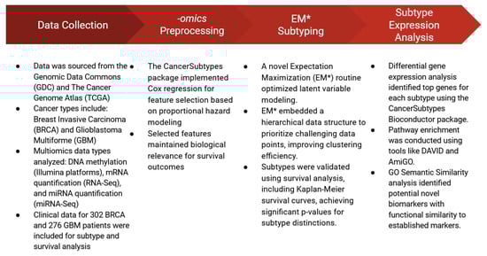 Figure 8 illustrates the multi-step workflow employed in this study, including data collection, preprocessing of multiomics datasets, implementation of the improved EM* algorithm for clustering, and subsequent subtype expression analysis. This workflow emphasizes the integration of biologically informed feature selection with robust clustering methodologies to identify clinically relevant cancer subtypes.