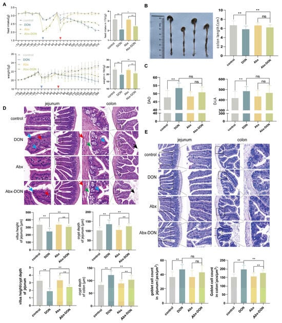 Effects of DON on body weight, feed intake and intestinal pathological injury in mice; (A) The effect of DON on body weight in mice during the experiment; the effect of (A) DON on feed intake in mice during the experiment, with blue triangles representing the first gavage of quadruple antibiotics and red triangles representing the first gavage of DON; the feed intake of mice in the experiment for 17 days; the weight of mice at 18 days of experiment; (B) The effect of DON on colon length in mice. (C) Effects of DON and antibiotic-induced microbiome depletion DAO and D-LA; (D) H. E staining and Morphological measurement. From left to right, they are 40× (Bar = 20 μm), 20× (Bar = 50 μm), 40× (Bar = 20 μm), 20× (Bar = 50 μm) (Blue arrow: epithelial cell necrosis; red arrow: inflammatory cells present; green arrow: mild edema in the submucosal layer; black arrow: epithelial exfoliated cells in the intestinal lumen) (height of villi in the jejunum, depth of crypts in the jejunum, intestinal villus height/crypt depth and crypts in the colon) (E) AB-PAS staining and GCs counting. From left to right, they are 20× (Bar = 100 μm), 40× (Bar = 50 μm), 20× (Bar = 100 μm), 40× (Bar = 50 μm). * p < 0.05, ** p < 0.01.