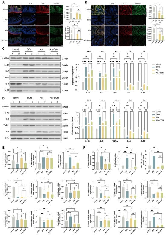Effects of DON on the mechanical and immune barrier of the intestine. (A) Immunofluorescence detection of jejunum tight junction protein (ZO-1 + occludin); (B) Immunofluorescence detection of colon tight junction protein (ZO-1 + occludin); (C) Western blot test of jejunal inflammatory factor; (D) Western blot test for colonic inflammatory factors; (E) Jejunum tight junction and inflammatory factor mRNA levels; (F) Colonic tight junction and inflammatory factor mRNA levels (n = 8). * 0.01 < p ≤ 0.05, ** 0.001 < p ≤ 0.01, *** p ≤ 0.001.