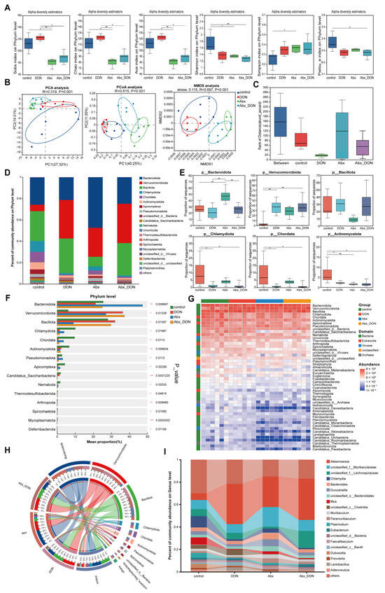 Effects of DON on intestinal flora species of mice during the experiment. (A) Alpha diversity index bar graph on Phylum level; (B) Principal component analysis on Phylum level, principal co-ordinates analysis on Phylum level and non-metric multidimensional scaling on Phylum level; (C) Analysis of similarities on Genus level; (D) on Phylum level; (E) The microorganisms with an abundance greater than 5.00% were analyzed in the box pattern; (F) Kruskal–Wallis H test bar plot on Phylum level; (G) Heatmap analysis on Phylum level; (H) Circos map of samples and species on Phylum level; and (I) Percent of community abundance on Genus level (n = 6). * 0.01 < p ≤ 0.05, ** 0.001 < p ≤ 0.01.