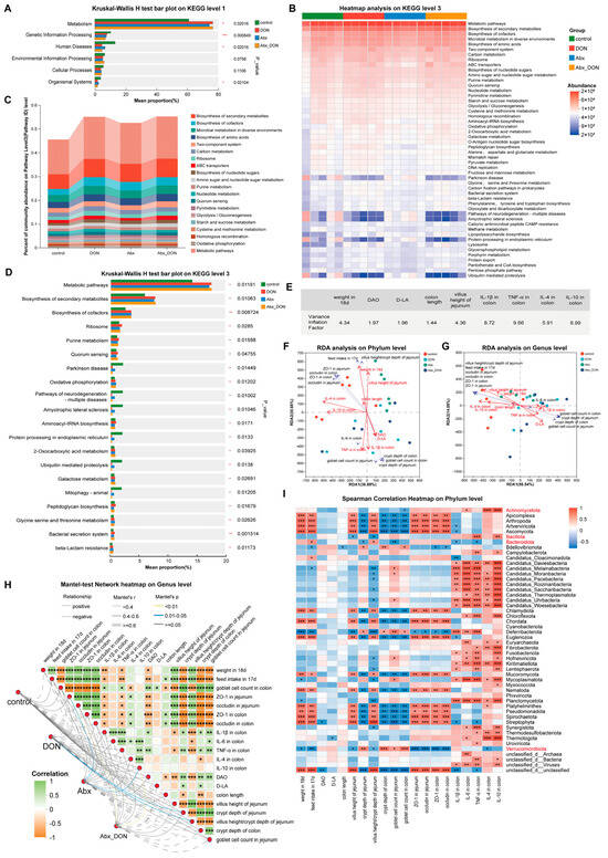 Effects of DON on KEGG pathway and joint analysis of species and pathological and inflammatory indicators. (A) Kruskal–Wallis H test bar plot on KEGG level 1; (B) Heatmap analysis on KEGG level 3, and each column represents a sample, the Y axis is the top 50 abundant channels and the abundance decreases from top to bottom; (C) Percent of community abundance on Pathway Level 3 (Pathway ID); (D) Kruskal–Wallis H test bar plot on KEGG level 3; (E) Variance inflation factor analysis results; (F,G) The CCA scatter plot of the sample distribution at the level of genus shows the distribution of samples and where the points represent the samples, and the different colors of the points represent samples from different groups. The distance between the points represents the similarity and difference in functional composition between the samples, and the pathological and inflammatory indicators are represented by arrows. The length of the arrow line represents the degree of correlation between the species distribution and the pathological and inflammatory indicators, with longer lines indicating a stronger correlation and shorter lines indicating a weaker correlation. The angle between the pathological and inflammatory indicators represents the positive or negative correlation between the pathological and inflammatory indicators (acute angle: positive correlation; obtuse angle: negative correlation; right angle: no correlation). (H) Mantel Test heat map, where the lines represent the correlation between the community and the pathological and inflammatory indicators, and the heat map represents the correlation between the pathological and inflammatory indicators. The thickness of the lines represents the correlation between the community and the pathological and inflammatory indicators, drawn using Mantel’s r (the absolute value of R). The solid and hollow lines represent positive and negative, respectively, indicating the correlation between the community and the pathological and inflammatory indicators. The different colors in the heat map represent the positive and negative correlations, with the depth of the color representing the size of the correlation, and the stars in the blocks representing significance. (I) The X and Y axes represent the indicators and species, respectively, with red representing positive correlation and blue representing negative correlation. On the Y-axis, the ones marked in red represent bacteria with genus abundance greater than 5.00%. * 0.01 < p ≤ 0.05, ** 0.001 < p ≤ 0.01, *** p ≤ 0.001 (n = 6).