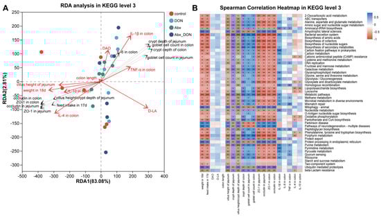 Using the same calculation method, pathological and inflammatory indicators were jointly analyzed with KEGG level 3 (based on abundance) in each group. The results were shown in Figure 5A. At the KEGG level 3, the RDA1 and RDA2 axes accounted for 85.89% of the variables functionally. The indicators with VIF < 10 showed the same trend as those at the phylum and genus levels of microorganisms, except for the observed negative correlation between D-LA and DAO, which may be due to the different pathways that are involved by D-LA and DAO. Furthermore, we conducted a heatmap analysis on the relationship between pathological and inflammatory indicators and various pathways. As Figure 5B shows, among the top 50 pathways with total abundance at the classification level, most pathological and inflammatory indicators showed the same correlation trend, with weight at 18d, feed intake at 17d, villus height of jejunum, villus height/crypt depth ratio of jejunum, ZO-1 in jejunum, occludin in jejunum, ZO-1 in colon, occludin in colon and IL-1β in colon. We also observed a positive correlation between the pathological and inflammatory indicators in regulating metabolic pathways (p < 0.05), except for crypt depth of jejunum, crypt depth of colon and goblet cell count in jejunum and colon, which were negatively correlated in regulating metabolic pathways (p < 0.05).