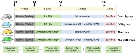 After 7 days adaptation period, mice were randomly allocated into four groups with a total of 12 mice in each group. The control group received only 1× PBS + deionized water, the DON group received 1× PBS + DON solution, the Abx group received antibiotics + deionized water, and the Abx-DON group received antibiotics + DON solution. The summary information of the treatment groups is shown in Figure 6.