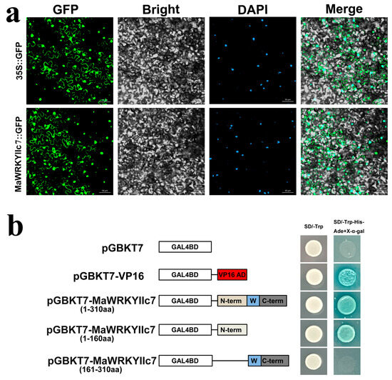 Subcellular localization and transcriptional activation assay of MaWRKYIIc7. (a) Subcellular localization of MaWRKYIIc7 in the tobacco epidermis. Fluorescence detection of tobacco leaf epidermal cells, with 35S:GFP transformed tobacco epidermis as control; DAPI is the nuclear localization marker. (b) Schematic diagram of different fragments of MaWRKYIIc7 connected to pGBKT7 vector. Yeast cells are cultured on tryptophan deficient medium (SD-T) and selective medium lacking tryptophan, histidine, and adenine (add X-α-D galactosidase, SD-T/H/A+X-α-gal).