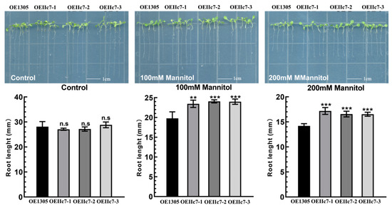 Overexpression of MaWRKYIIc7 in Arabidopsis enhances drought tolerance. Effect of mannitol treatment on MaWRKYIIc7 overexpression in Arabidopsis. Determination of main root length after 5 d of mannitol treatment (0, 100, and 200 mM). Asterisks indicate the significant difference among OE1305, OEIIc7-1, OEIIc7-2, and OEIIc7-3 lines under the same treatment (** significant difference at p < 0.01, *** significant difference at p < 0.001, n.s indicates no significant difference).