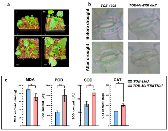 Phenotype of MaWRKYIIc7 transient overexpression transformed mulberry seedlings after drought treatment. (a) Phenotypic analysis of MaWRKYIIc7 transient overexpression mulberry seedlings after 10 d of drought treatment. I, II image depicts the plants subjected to control treatment (TOE-1305) and III, IV is a genetically modified plant (TOE-MaWRKYIIc7). (b) Observation of stomatal opening of TOE-1305 and TOE-MaWRKYIIc7 before and after drought treatment. (c) Effects of drought treatment on the contents of MDA, POD, SOD, and CAT in TOE-1305 and TOE-MaWRKYIIc7 (* significant difference at p < 0.05; ** significant difference at p < 0.01).