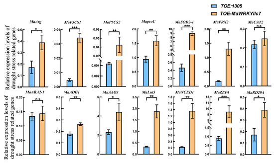 The expression pattern of drought stress related genes in MaWRKYIIc7 overexpression mulberry (* significant difference at p < 0.05, ** significant difference at p < 0.01, *** significant difference at p < 0.001, n.s indicates no significant difference).