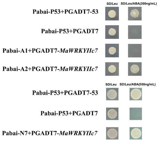 The promoter sequence containing W-box elements was ligated into the pAbAi vector and transformed into yeast Y1H receptor cells after digestion. The minimum AbA concentration was determined, and the recombinant plasmid pGADT7-MaWRKYIIc7 was translated into Y1H receptor cells containing the abovementioned plasmid [61]. The empty AD plasmid was used as a negative control, and yeast growth was observed on SD/−Leu plates with or without AbA.