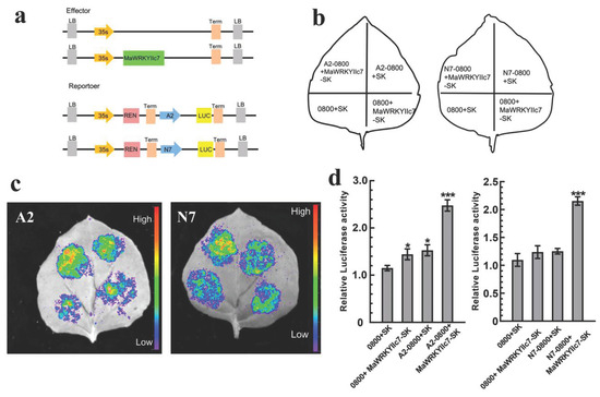 Dual-luc assays validate MaWRKYIIc7 binding to proMaRD29A and proMaNCED1 to activate their transcription activity. (a) Schematic diagrams of the effector and reporter vectors used in Dual-luc assays. (b) Layout pattern diagram of tobacco leaf infection. (c) Fluorescence intensity measurement of Dual-luc assays. (d) Relative luciferase activity detection. Asterisks indicate significant differences (* significant difference at p < 0.05, *** significant difference at p < 0.001).