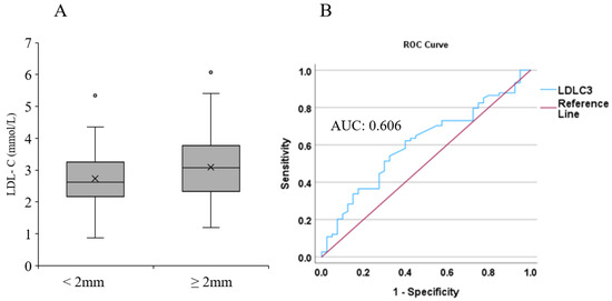 The LDL-C level was determined in 151 melanoma patients. The mean age at cohort entry was 62.9 (range, 29.9–84.3) years for men and 60.6 (range, 30.6–80.4) for women. The mean LDL-C levels were 2.78 nmol/L in men and 3.11 nmol/L in women. Melanoma patients were divided into two subgroups according to the Breslow thickness of the primary tumors (<2.00 mm and ≥2.00 mm). Compared to patients who had thinner primary melanoma (<2.00 mm; n = 41), those who had thicker primary melanoma (≥2.00 mm; n = 73) had higher LDL-C levels; however, this difference was not significant (p = 0.062; Figure 1A). Additional adjustment for age, gender, therapy, and the presence of tumor using a logistic regression model revealed that higher LDL-C value was significantly associated with the risk of a thicker primary tumor (OD: 1.786; CI: 1.087 to 2.935; p = 0.022). In the ROC curve, the area under the curve (AUC) for LDL-C level was 0.606 (Figure 1B).