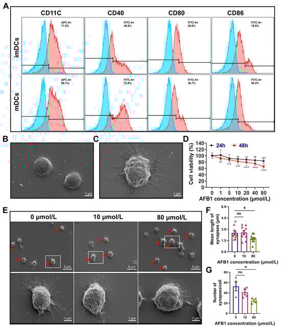 Effects of AFB1 on the survival and morphology of DCs. (A) Immunophenotypic molecular identification of DCs. The blue histogram represents unstained control cells, and the red histogram refers to cells stained with the fluorescein-conjugated antibody. APC: allophycocyanin; FITC: fluorescein isothiocyanate; (B,C) Morphological characteristics of imDCs (B) and mDCs (C) observed under SEM at a magnification of ×22,000. (D) Viability of DCs treated with 0, 1, 5, 10, 20, 40, and 80 µmol/L AFB1 for 24 and 48 h. (E) Morphological changes in DCs after AFB1 treatment observed under SEM at magnifications of ×5000 and ×22,000. Living DCs as the red arrows indicated were used for statistical analysis in (E), and the representative DCs in the white boxes are enlarged and displayed at lower panel. (F) Mean length of synapses of DCs. (G) Number of surface synapses on DCs. ns, no significant difference; * p < 0.05; ** p < 0.01; *** p < 0.001; **** p < 0.0001.