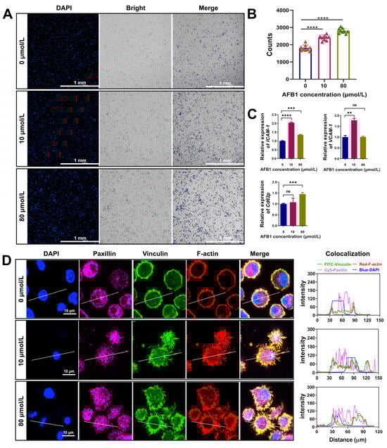 AFB1 enhances cell adhesion by modulating the expression of adhesion molecules in DCs. (A) After 24 h of DC adherence, DAPI staining was performed and the number of cells adhering to the well plates was detected by fluorescence microscopy. (B) Statistical analysis of the number of adherent cells. (C) RT-qPCR analysis of intracellular adhesion molecules. (D) Confocal laser scanning microscopy was employed to analyze the expression and subcellular localization of paxillin and vinculin in DCs after AFB1 treatment. DAPI: 4′,6-diamidino-2-phenylindole; Cy5: cyanine 5; FITC: fluorescein isothiocyanate; ns, no significant difference; ** p < 0.01; *** p < 0.001; **** p < 0.0001.