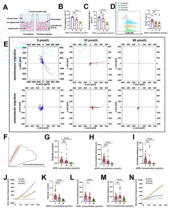 The adhesive capability of cells exerts an influence on their migratory capacity; accordingly, we postulate that AFB1 additionally modulates the migratory capability of DCs. In order to validate this postulation, we employed the Transwell assay to assess both the spontaneous and chemotactic migration capabilities of DCs (Figure 3A). The results demonstrated a significant decline in both the spontaneous and chemotactic migration abilities of DCs following AFB1 treatment (Figure 3B,C). This finding aligns with the conclusion that AFB1 enhances the adhesion of DCs. CC-chemokine receptor 7 (CCR7), a crucial chemokine receptor regulating DC migration, localization, development, and differentiation, was further examined. Through flow cytometry analysis, we found a significant downregulation of CCR7 expression on the surface of DCs treated with AFB1 (Figure 3D). Furthermore, we employed time-lapse photography for cellular tracking to capture the movement trajectories of DCs inoculated onto a substrate of uniform stiffness over a period of 30 min, following exposure to AFB1 (Figure 3E). The results indicated that the velocity of free migration, migration distance, and mean squared displacement (MSD) of DCs treated with AFB1 on a substrate were significantly reduced (Figure 3G–J). Additionally, the MSD exhibited a power-law relationship with time. Similarly, the chemotaxis migration results also demonstrated that AFB1-treated DCs exhibited slower migration velocities and shorter migration distances (Figure 3K–N). Collectively, these results indicate that AFB1 inhibits the migratory ability of DCs.