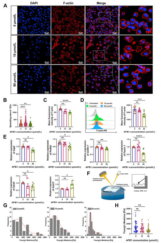 The cytoskeleton and focal adhesions constitute the functional underpinnings of cellular migration and adhesion [,]. The reorganization of the cellular cytoskeleton represents a pivotal internal mechanism underlying changes in cell morphology []. Consequently, we investigated the effects of AFB1 on the cellular cytoskeleton. Through immunofluorescence analysis, we examined DCs exposed to AFB1 and observed that these cells progressively spread, accompanied by a decrease in the average fluorescence intensity of the cytoskeletal protein F-actin (Figure 4A–C). Consistent with these observations, flow cytometry analysis further confirmed a reduction in the average fluorescence intensity of F-actin in AFB1-treated DCs (Figure 4D). These findings suggest the possibility that AFB1 may regulate the expression of genes associated with cytoskeletal structure. To test this hypothesis, we performed RT-qPCR analysis on six genes typically involved in cytoskeletal reorganization: Profilin, CapZ, Fascin1, Cofilin, Cdc42, and the Arp2/3 complex. As expected, while low concentrations of AFB1 did not significantly alter the expression of these six genes in DCs, high concentrations significantly downregulated Profilin, CapZ, Fascin1, Cofilin, and Cdc42. Conversely, the expression level of the Arp2/3 complex was notably upregulated (Figure 4E). Additionally, considering that alterations in the mechanical properties of the cell surface can impact cell morphology, we analyzed the Young’s modulus of DCs after AFB1 treatment. Our results demonstrated a concentration-dependent and significant decrease in the Young’s modulus of AFB1-treated DCs, suggesting that AFB1 treatment diminishes DC rigidity, thereby facilitating morphological changes (Figure 4F–H). In summary, our research reveals that AFB1, through the modulation of cytoskeleton-associated gene expression and the subsequent restructuring of the cytoskeleton, coupled with a reduction in cellular rigidity, ultimately triggers changes in cell morphology. This morphological transformation ultimately influences the cellular adhesive properties and migratory capabilities.