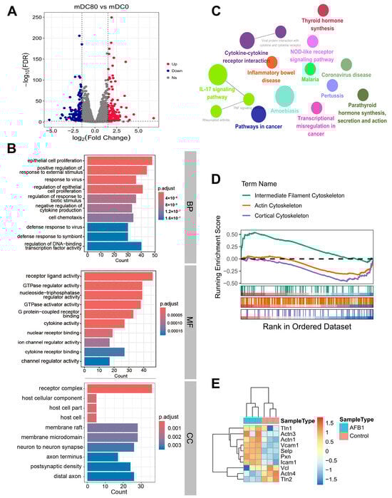 Gene expression profiles perturbed by AFB1 in DCs. (A) Volcano plot depicting the differentially expressed genes (DEGs) comparing 80 µmol/L AFB1-treated versus control samples, with genes considered significant at |log2FC| ≥ 1.5 and FDR < 0.05. ns, no significant difference. (B,C) GO enrichment analysis (B) and KEGG enrichment analysis (C) of the identified DEGs. (D) GSEA ranked by log2FC. (E) Heatmap representing the expression of adhesion-molecule- and cytoskeletal-related genes in DCs based on RNA-seq data, with TPM values normalized to z-scores. Tln: talin-1; Actn: actinin alpha; Vcam-1: vascular cell adhesion molecule 1; Selp: selectin P; Pxn: paxillin; Icam-1: intercellular cell adhesion molecule-1; Vcl: vinculin.