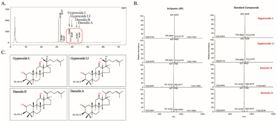HPLC/MS analysis of Actiponin (AP). (A) HPLC chromatogram of Actiponin. Red rectangle represents major gypenosides present in AP. (B) Major gypenoside compounds identified by HPLC/MS analysis of AP and standard gypenoside compounds. (C) Chemical structure of gypenoside L, gypenoside LI, damulin B and damulin A.
